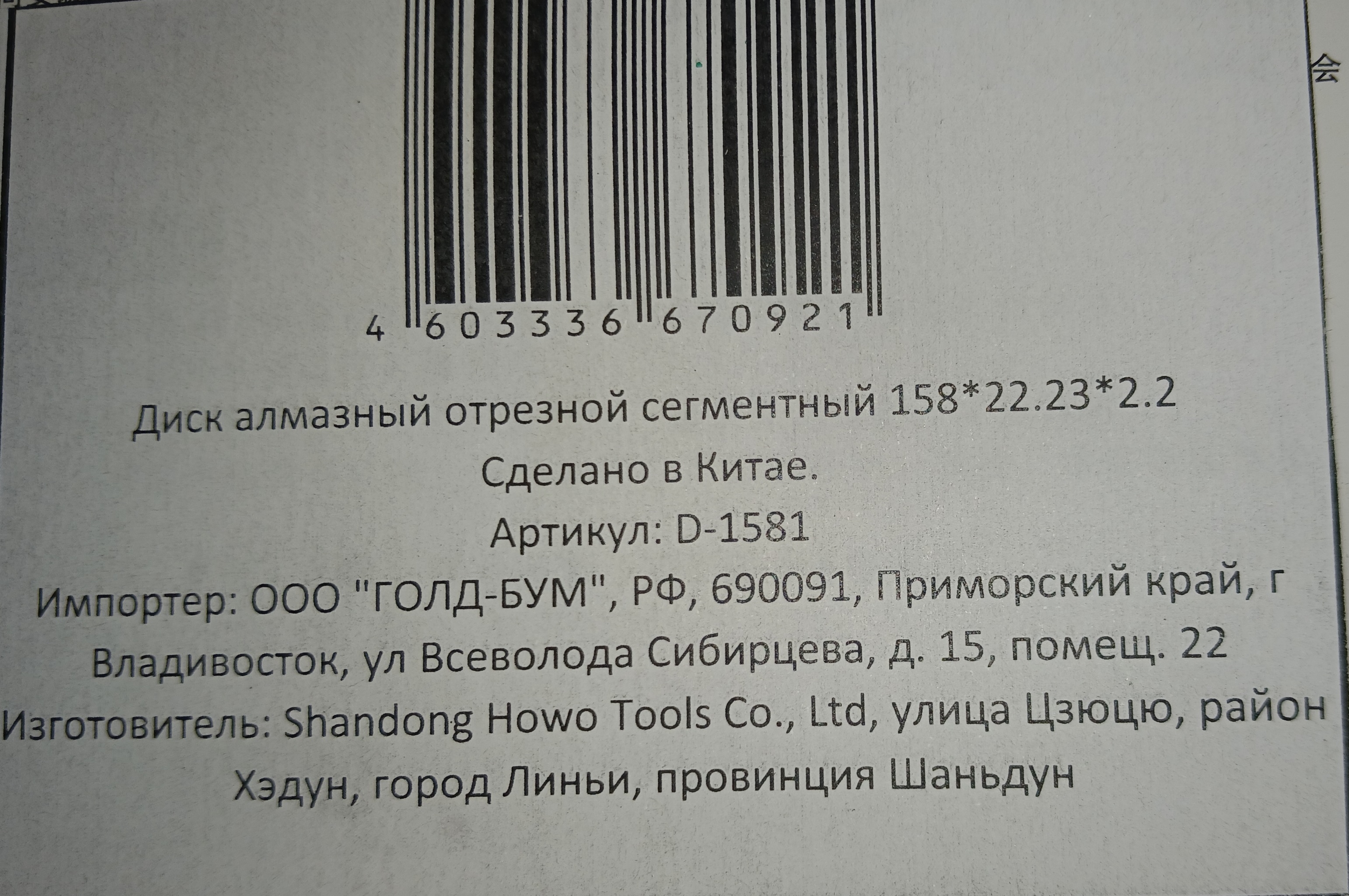 Диск алмазный отрезной сегментный 158*22.23*2.2