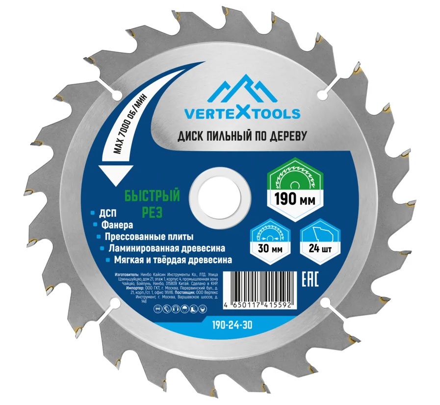 Технические характеристики пильного диска по дереву vertextools 190-24-30