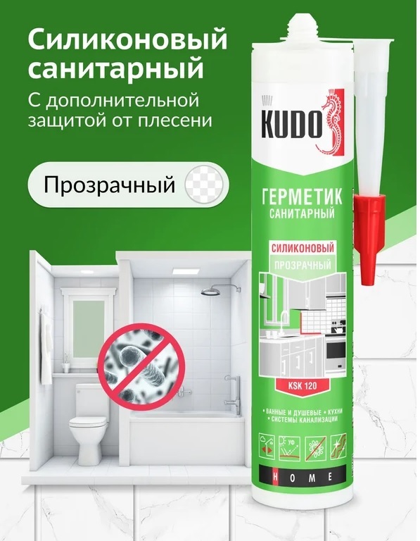 Силиконовый санитарный герметик KUDO (прозрачный; 280 мл) KSK-120 применяется при общих бытовых, ремонтных и строительных работах. Cодержит специальные антисептические добавки, препятствующие образованию плесени и грибков. Идеально подходит для помещений с повышенной влажностью: ванных комнат, душевых кабин, кухонь и для остекления. Применяется для уплотнения соединительных швов вокруг ванн, раковин, бассейнов, герметизации стыков при установке сантехнического оборудования, гидроизоляции поверхностей, заделки швов между плитками. Устойчив к воздействию большинства моющих и чистящих средств, стоек к УФ‑излучению, атмосферным воздействиям, температурным перепадам и практически любым агрессивным средам.