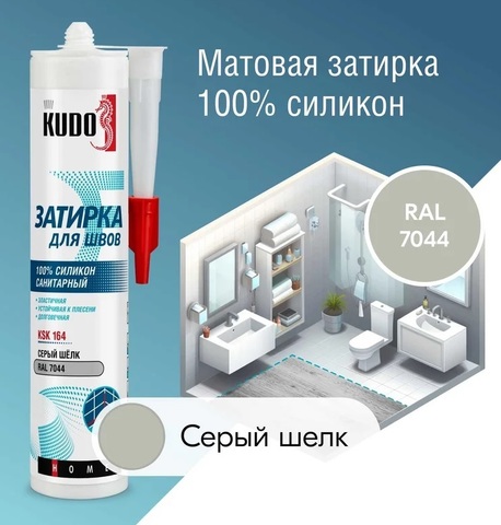 Герметик-затирка для швов KUDO HOME силиконовый санитарный, серый шёлк RAL 7044 KSK-164 - высококачественный герметик-затирка с системой отверждения ацетокси применяется для заполнения швов, подверженных деформации (теплый пол, экстерьер, террасы, угловые примыкания). Идеально подходит для помещений с повышенной влажностью: ванных комнат, душевых кабин, кухонь, для остекления и т.д.
