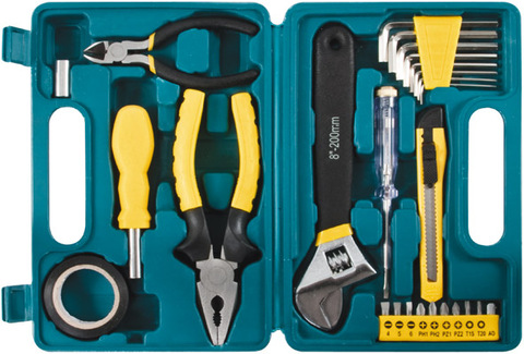 В наборе: пассатижи (165 мм); ключ разводной (200 мм); отвертка индикаторная; бокорезы "мини" (115 мм); переходник с воротка 1/4" на биту; переходник с биты на головку 1/4"; отвертка с магнитным фиксатором бит; 8 ключей HEX (1.5, 2.0, 2.5, 3.0, 4.0, 5.0, 5.5, 6.0 мм); 9 бит - 25 мм (SL4, SL5, SL6, PH1, PH2, PZ1, PZ2, T15, T20); лента изоляционная, нож технический (9 мм). Материал: инструментальная сталь, пластик, биты из хром-ванадиевой стали. Упаковка: пластиковый чемодан.