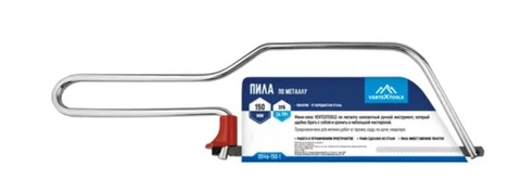 Представляет собой конструкцию, которая позволяет распилить металлические заготовки. Длина режущего полотна 150 мм, оно надежно крепится резьбовым зажимом к жесткому каркасу, выполненному из инструментальной стали. Рукоятка выполнена под определенным углом, что позволяет ощущать направление хода лезвия и корректировать его.