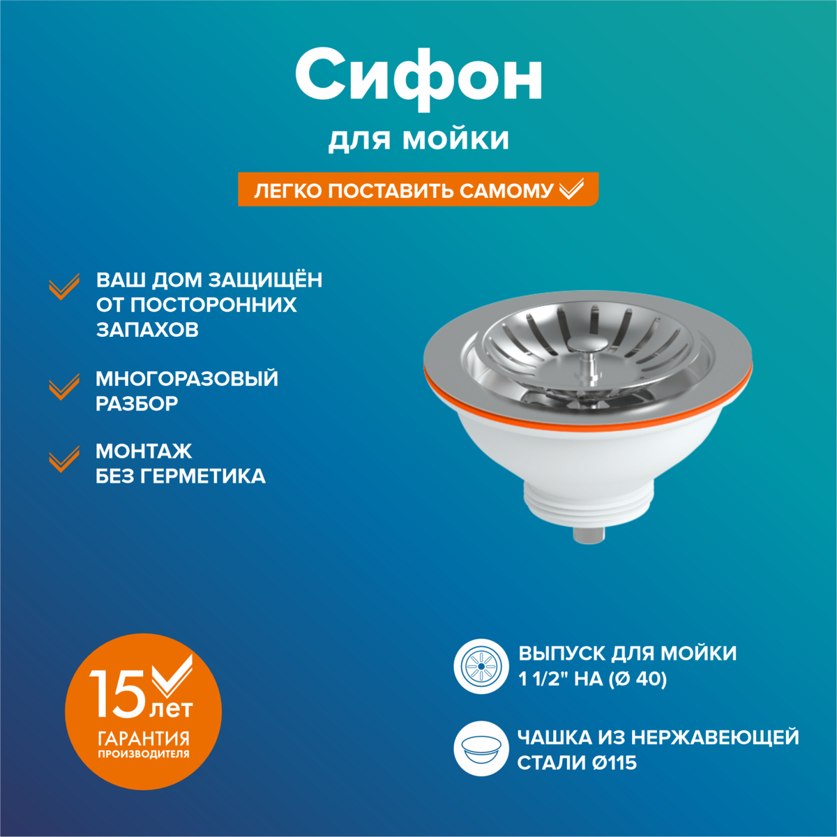 Выпуск для мойки 1 1/2" на (Ø 40) чашка из нержавеющей стали Ø115 винт, шток, ручка - пластик